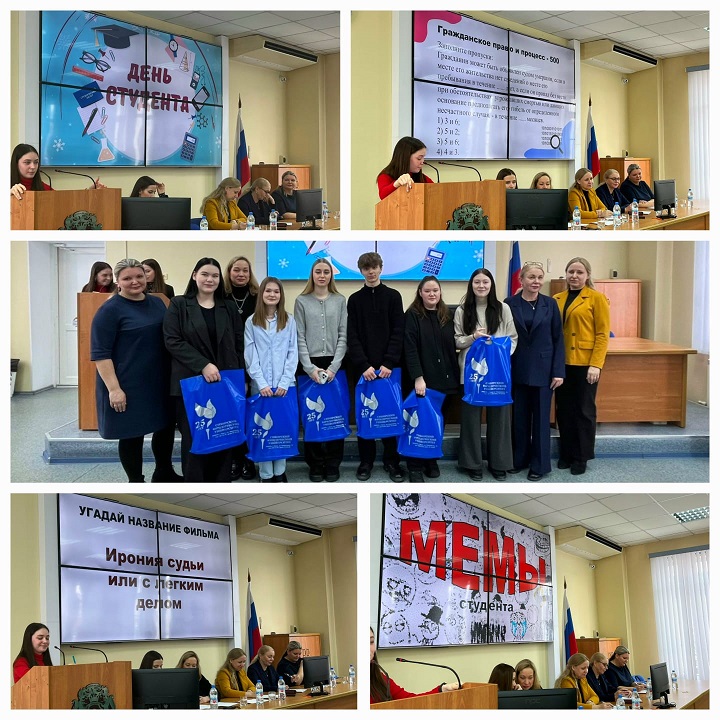 25 января в стенах Сибирского юридического университета прошло мероприятие, посвященное Дню Студента, организованное студентами университета при поддержке Центрального районного суда г. Омска. Ребята из Омского юридического колледжа, а также гости из Омской академии экономики и предпринимательства приняли участие в занимательной игре, где их ждали задания разного формата: правда/ложь о дне студента, своя игра, угадай преступление по мультфильму, песенный раунд и многое другое. Ребята открыли для себя интересные факты, касающиеся Дня студента, продемонстрировали свои знания в различных отраслях права, повеселились в процессе раунда «Мемы», посвящённый студенческой жизни. В качестве членов жюри выступили заместитель председателя Центрального районного суда г. Омска по гражданским делам Компанеец А.Г., помощник председателя Центрального районного суда г. Омска Рамазанова Е.В., судья Центрального районного суда г. Омска Айринг О.А., заместитель директора по административно-правовой работе и практической подготовке Бурцева Н.В., а также преподаватель университета Кнауб А.В. Хочется отметить прекрасную